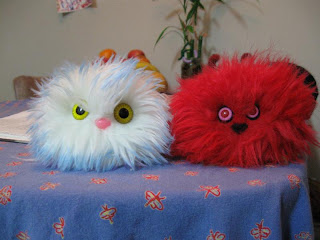 This hat is from Last Minute Knitted Gifts (Kim's hats), slightly modified to 5 stitches/inch (cast on 96 stitches, in the round), #7 needles, knit with lovely Classic Elite Inca Alpaca yarn and a couple of modified pom poms with this and that from my stash. Now I really have no reason not to get to sewing up those darn dinosaurs, except that every time I cloister myself in the utility room, Eva comes-a-knockin'...